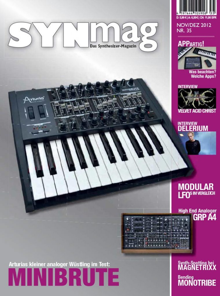 Arturia Minibrute • Doepfer A-143-4 • Vermona fourMulator • Marienberg LFO • LFO Resümee • Korg Monotron Bending • GRP A4 • Korg DDD 1 • Metasynth • Reason 6.5 • Apps-Special • KOMA • Roland SBF 325 Stereo Flanger • Baby Box V3 Noise-Generator • Program Your 808 • Custom One Pro • Velvet Acid Christ • Delerium • Magnetrixx • A Critical Mass • Officers